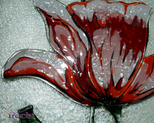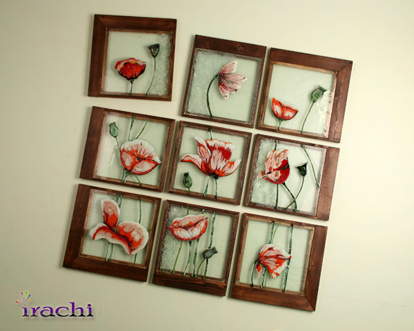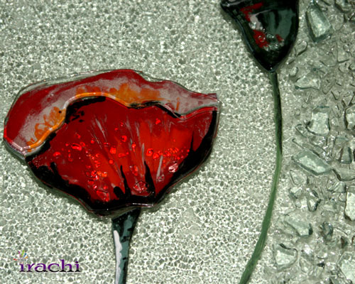تابلو ۹ لته ای گلهای شقایق یکی از انواع این نمونه هاست . در این تابلو هنرمند با استفاده از فیوز گلهای شیشه ای , که همگی به زیبایی نقاشی شده اند , به ترکیب بسیار جذاب و زیبایی رسیده است . استفاده از خرده های شیشه بر روی گلها حسی از شبنم به آن داده است که گلها را بسیار طبیعی تر جلوه می دهد . در بعضی از قطعات این تابلو دانه های درشت تری از شیشه فیوز شده اند که جذابیت کار را بسیار بالا برده است .