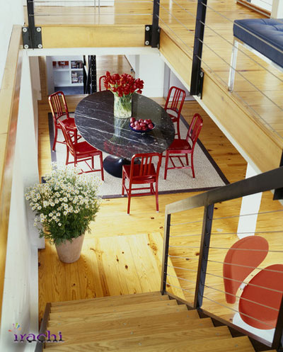 واقعا عجیب است که چنین ترکیبی با هم همخوانی دارد. شاید گرمای چوب و همچنین گرمای رنگ قرمز باعث هارمونی آن شده است. البته میز مشکی که ظاهری کاملا طبیعی دارد نیز ترکیب همگونی با کفپوشهای چوبی بوجود آورده است. | ![]() |
