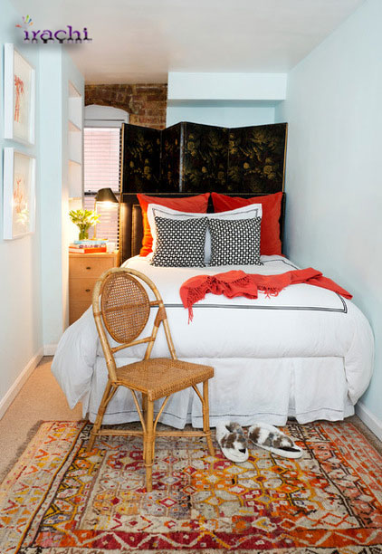 حتی در اتاقهای کوچک هم میتوان از ترکیب قرمز و مشکی استفاده کرد. در این اتاق استفاده از فرش قرمز ایرانی گرمای خاصی به سردی دیوارهای سفید و هچنین صفحه مشکی پشت تخت بخشیده است. | ![]() |