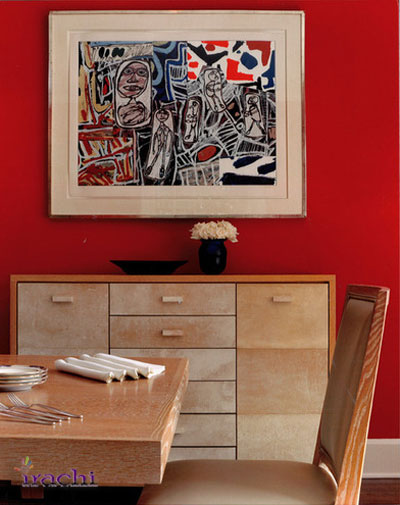 بد نیست که همراه مبلمان و وسایل خانگی مدرن، از رنگ سفید و قرمز استفاده کرد. گرمای و شلوغی تابلوی نقاشی قرمز و سیاه را همین کمد و میز چوبی تعدیل کردهاند. همچنین استفاده از مبلمان مدرن در کنار دیوار قرمز نیز همنشینی زیبایی بوجود خواهد آورد. | ![]() |