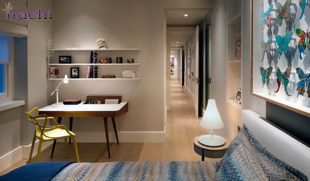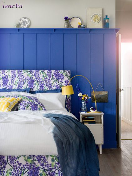 همانطور که در عکس مشاهده می نمایید از تلفیق دو رنگ آبی پر رنگ و نفتی و زرد لیمویی در قسمت هایی از اتاق تلفیق زیبایی پدید امده است و چراغ خواب و بالش ها در رنگ های آبی و بنفش بخوبی مخلوط شده اند