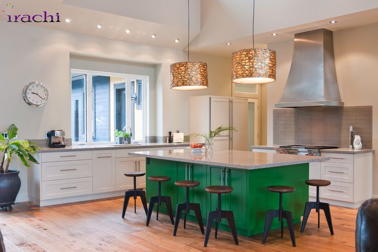 یک جزیره سبز در میان خانه جالب نیست همانطور که در عکس مشاهده می نمایید در وسط خانه از یک دست کابینت با کانتر استفاده شده است که با رنگ سبز کلی رنگ آمیزی شده است