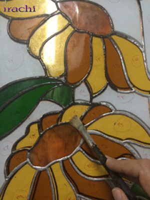 تابلو تیفانیپس از اتمام کار آن را می شوییم و در صورت تمایل قسمتهای لحیم شده را پتینه می کنیم . پتینه قلع نقره ای رنگ را به مسی و یا مشکی تبدیل کرده تا خطوط با شیشه ها همبستگی بیشتری پیدا کند .